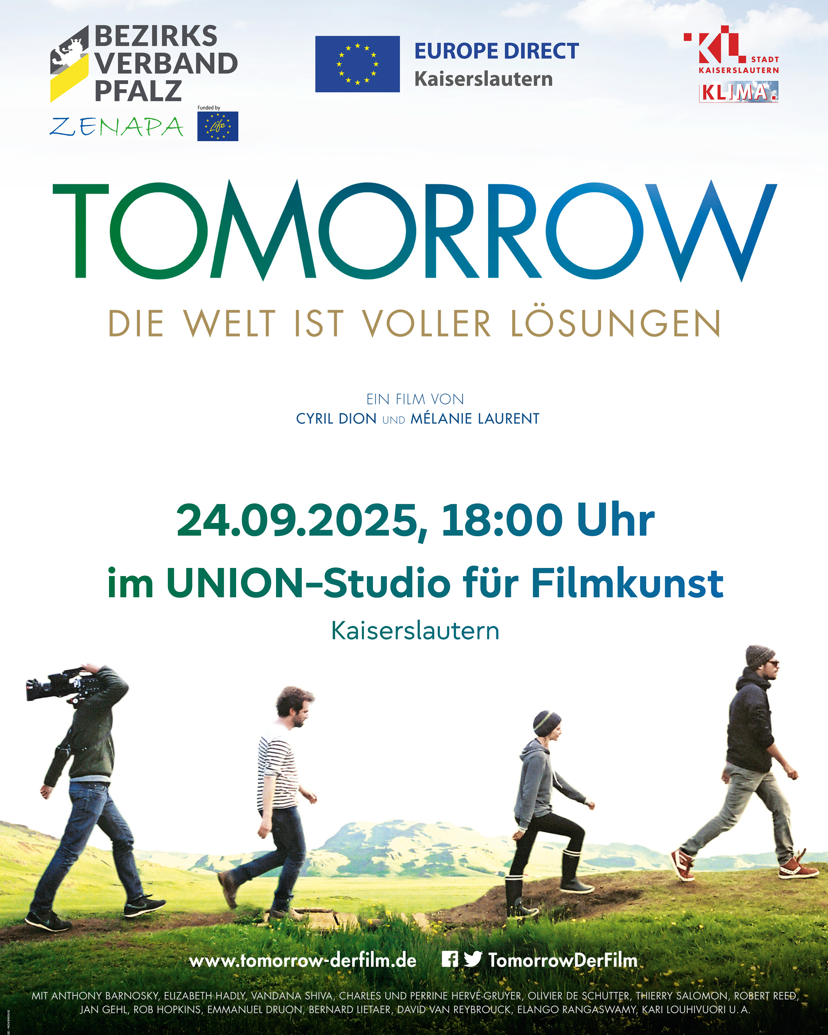 Weitere Informationen: Gezeigt wird der mehrfach ausgezeichnete Dokumentarfilm „Tomorrow – Die Welt ist voller Lösungen“. Die Schauspielerin Mélanie Laurent (Inglourious Basterds, Beginners) und der französische Aktivist Cyril Dion wollen sich mit der Aussicht auf den möglichen Zusammenbruch unserer Zivilisation in den kommenden Jahrzehnten nicht abfinden. Stattdessen machen sie sich auf den Weg, um weltweit nach Lösungen zu suchen. Der Eintritt ist frei.