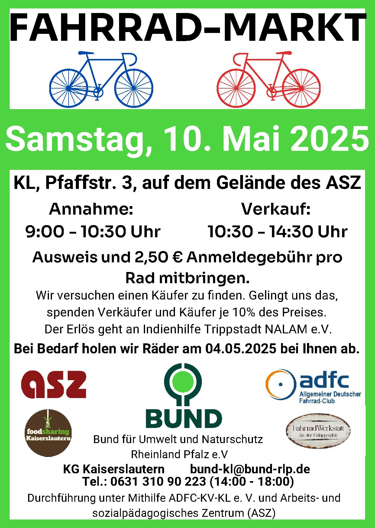 Der beliebte Fahrradflohmarkt für gebrauchte Räder findet seit 2022 mit neuen Partnern statt. Der BUND, ADFC und das ASZ führen den Flohmarkt aktuell einmal jährlich im Frühjahr durch.