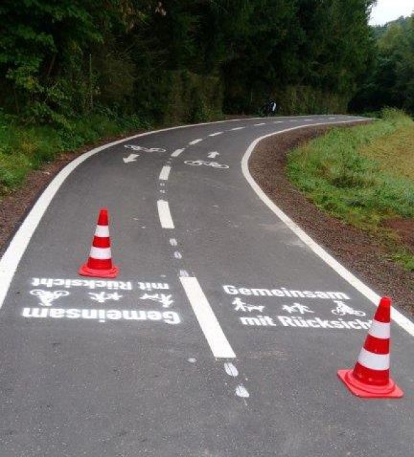 Der Ausbau des Lautertal-Radwegs im Zuge der Maßnahme "Pendler-Radroute Bachbahn" ist bald abgeschlossen, es stehen nur noch Restarbeiten wie die Markierung aus. Um auf dem stark frequentierten Weg ein möglichst entspanntes Miteinander zu gewährleisten, wurde eigens ein Piktogramm entworfen und aufgebracht, das für gegenseitige Rücksichtnahme wirbt.