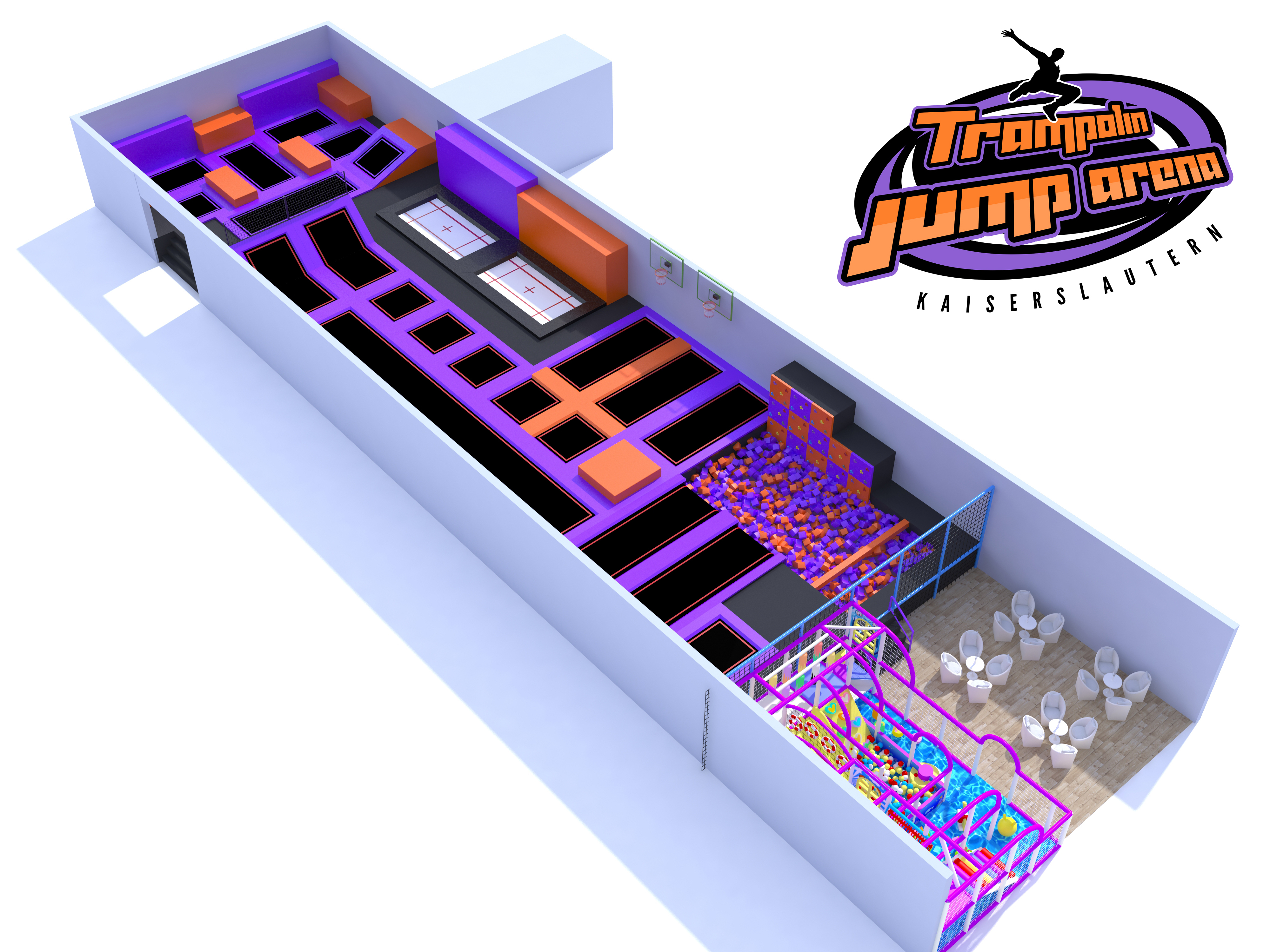 Über 400 qm Sprungspaß mit einer separaten Kids Area (zweistöckiger Kinderspiel- und Turnbereich) und Sitzmöglichkeiten für die „nicht Springer“.