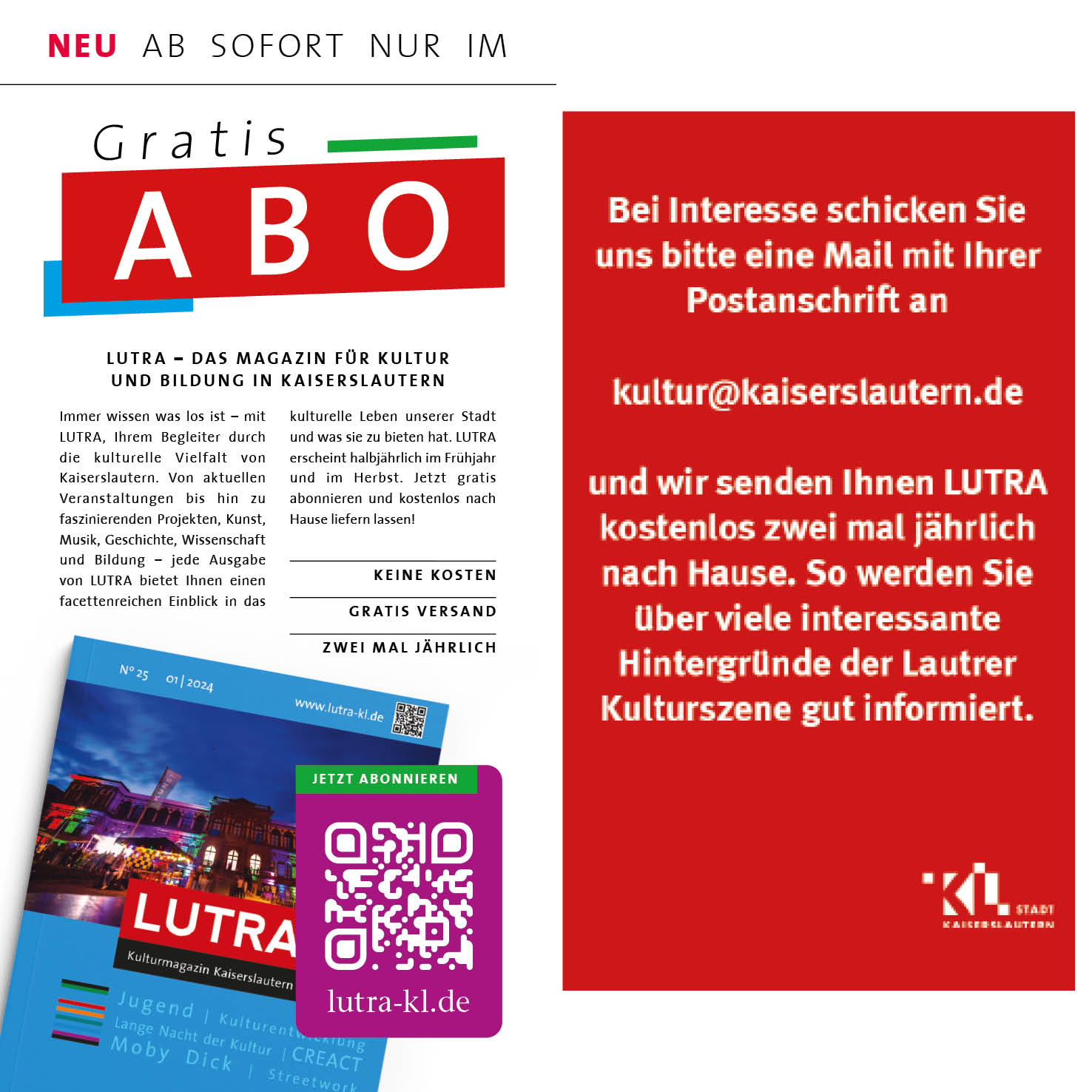 LUTRA ist nun kostenlos abonnierbar. Verpassen Sie keine Ausgabe und sichern Sie sich noch heute Ihr Gratis-Abo. Dazu schicken Sie uns bitte eine Mail mit Ihrer Postanschrift an kultur@kaiserslautern.de
