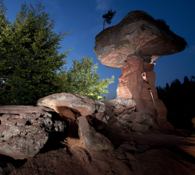- bizarre Felsgiganten aus Bundsandstein und mächtige Felsenburgen