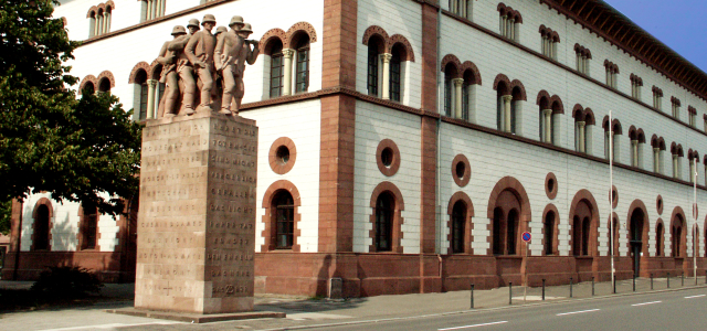 In the immediate neighbourhood of the steel and concrete architecture of City Hall is the imposing sandstone structure of the Palatinate Theatre, flanked by two masks in Carrara marble.