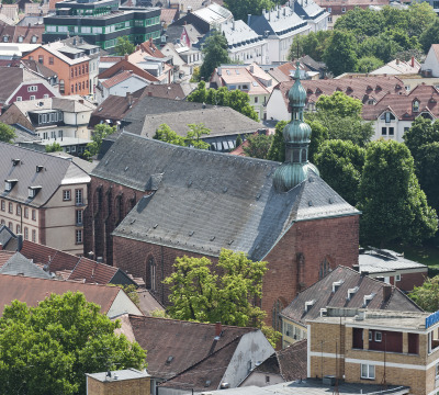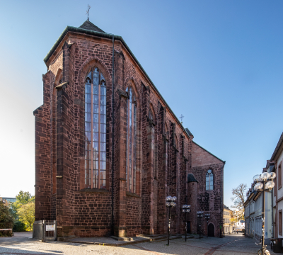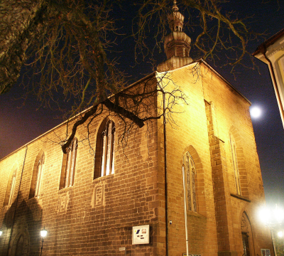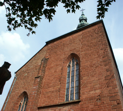 The statue outside the west door represents St. Nepomuk - the bridge saint. It was made at the beginning of the 18th century and previously stood on the so-called "Scherbrücke", a nearby bridge over the Lauter, which today flows underground. Behind, in the rectory garden, gravestones preserved from former cemeteries can be seen. The area is still bounded by remains of the medieval city walls.