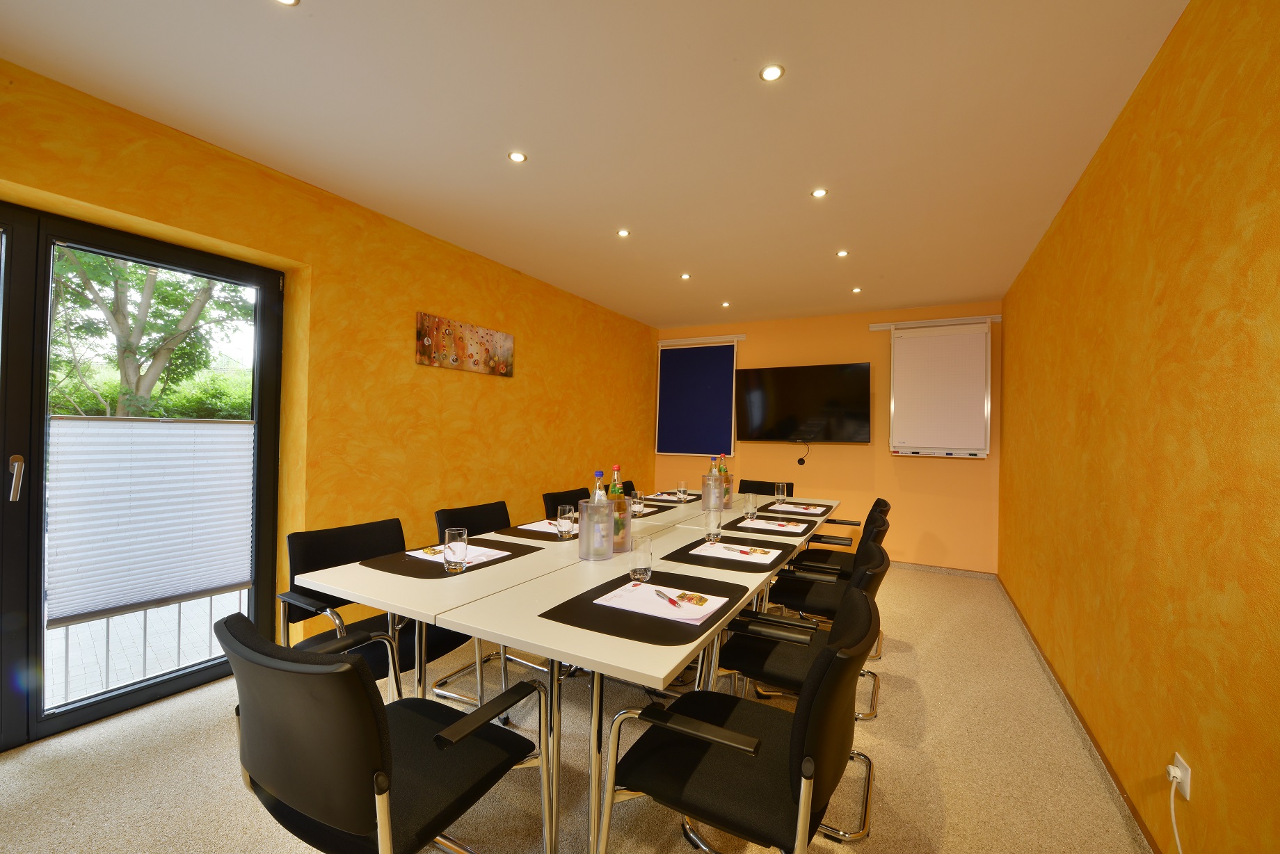 Ausstattung | Tageslicht, Verdunkelbar, alle 3 Räume sind klimatisiert, Standardtechnik = Starboard mit Beamer, Flipchart mit Stiften, Pinwand und Moderatorenkoffer, Drucker und Fax, Wlan |